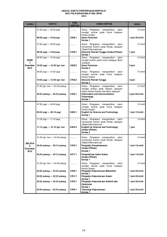 Heres a summary of the exam dates for major subjects. Download semua halaman 1-20. View Jadual Waktu Peperiksaan SPM 2015 Exam Timetable SPM 2015 timetable is available now.